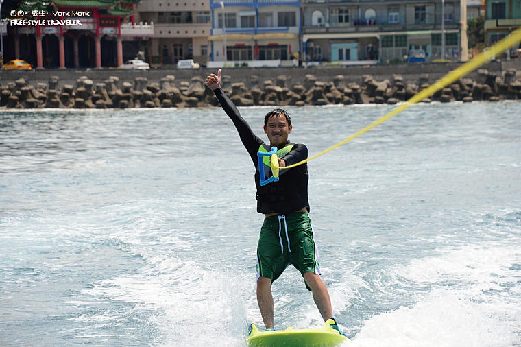 到我啦!當我跳落水嘅一刻,我就開始同自己講我要克服怕水,結果我可以冷靜咁浮喺水中,慢慢就爬上滑水板,開始啦!超緊張呀!
