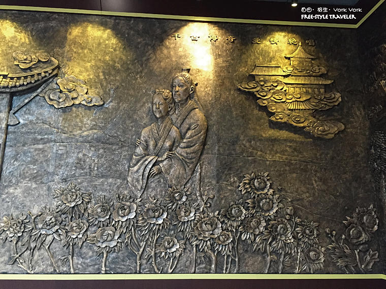 入面有一大片“銅畫”,雕刻了梁祝故事的每個情節。