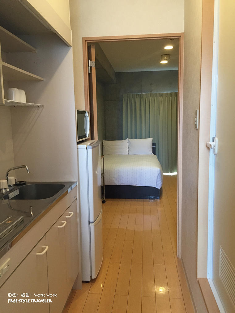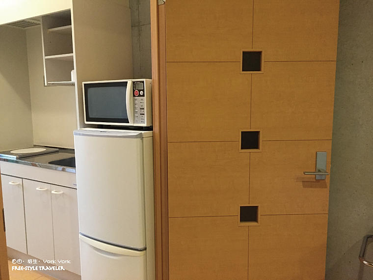 左手邊是開放式廚房,不但有雪櫃,還有微波爐,在這裡長住也不錯呢!